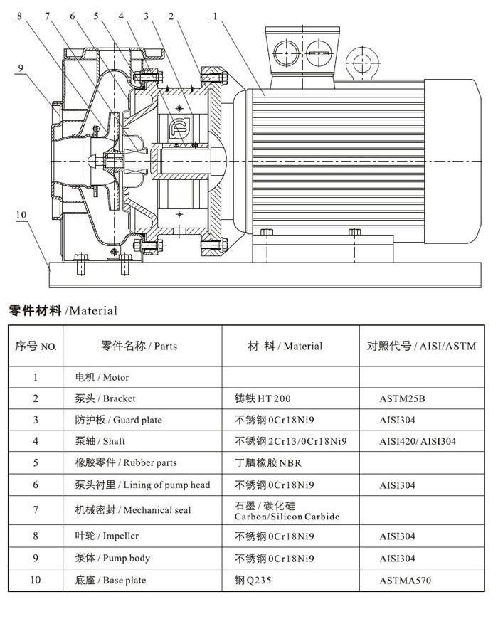 ZS型不锈钢卧式单级离心泵为泵轴直联型联结,由泵、泵轴和标准电机组成: