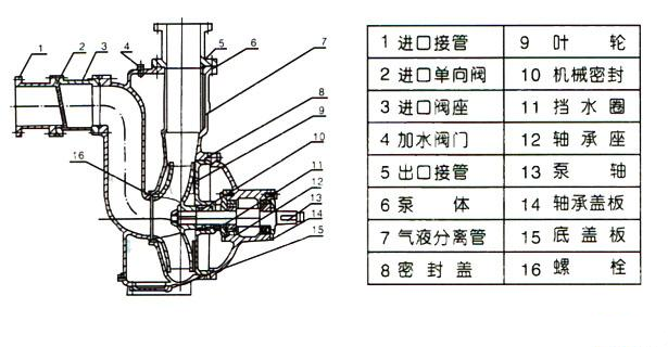ZW系列自吸式无堵塞排污泵,主要由泵体.叶轮、后盖、机械密封、泵轴、轴承座、进口阀、气液分离管、加水阀门、迸、排接管等组成。泵的结构见图。