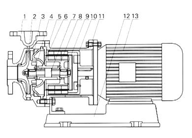 | 1 | 泵体 | 2 | 叶轮 | 3 | 轴承体 | 4 | 止推环 | 5 | 隔离套 | 6 | 轴套 | 7 | 泵轴 |