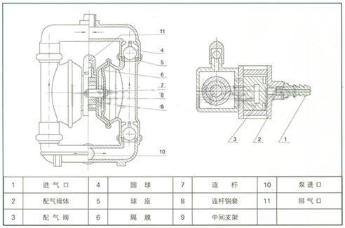在泵的两个对称各种腔中,各装有一块有弹性的隔膜6,联杆7将两块隔膜结成一体,压缩空气从泵的进气接头1进入配气阀3后,推动两个工作腔内的隔膜,驱使联杆联接的两块隔膜同步运动。与此同时,另一工作腔中的气体则从其隔膜的背后排出泵外;一旦到达行程终点,配气机构则自动地将压缩空气引入另一工作腔,推动隔膜朝相反方向运动,这样就形成了两个隔膜的同步往复运动。每个工作腔中又设置有两个单向球阀4,隔膜的往复运动,造成工作腔内容积的改变,迫使两个单向球阀交替地开启和关闭,从而将液体连续地吸入和排出。