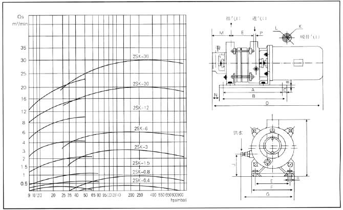 2SK系列适用于吸入压力低于-0.08MPa的工况条件。2SK-P1系列适用于吸入压力低于-0.096MPa的工况条件,在配用大气泵时,极限真空度可达-750mmHg。