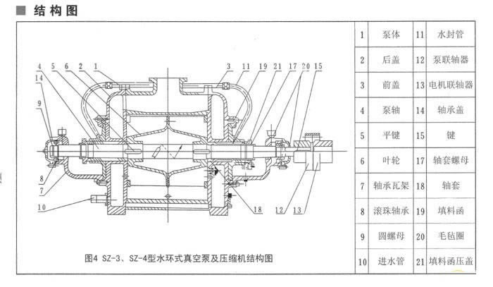 进气管(10)与气水分离器联在一起鸺给泵所需要的循环水,为了使泵腔的两端面间隙和填料得到很好的密封,必须由水封管(11)不断地鸺给干净的冷水。在联轴器端为了不使轴承内油外漏,因此装有毛毡圈(20)来密封。