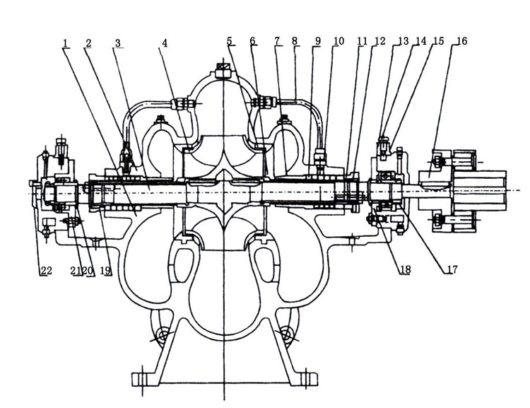 5、泵轴由两个单列向心球轴承支承,轴承装在泵体两端的轴承体内,用黄油润滑,双吸密封环用以减少水泵压水室的水漏回吸水室。