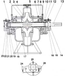 SOW型卧式蜗壳式双吸离心泵结构紧凑、稳定性好。该型泵为泵壳中开结构,进出口均在泵体上,检修时只需吊出泵盖,转子部件便可移出进行检修作业,而不需拆卸管路,十分方便。