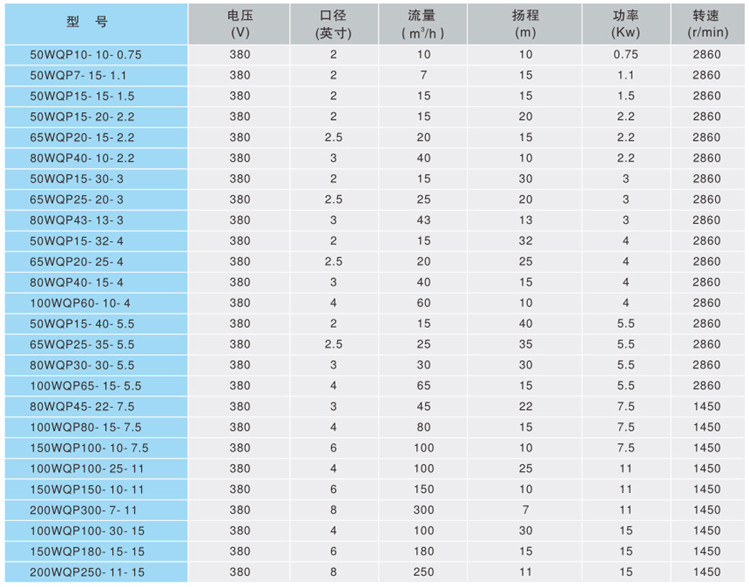 WQP型无堵塞潜水排污泵严格按照有关国家标准进行设计、制造和检验。供排送工商业污水、生活污水、城市污水处理厂排水系统、人防系统排水站、自来水厂的给水之用。
