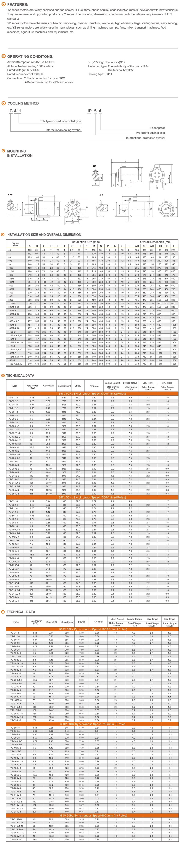 Y2系列电机的安装尺寸和功率等级符合IEC标准,与德国DIN42673标准一致,也与Y系列电机一样,其外壳防护等级为IP54,冷却方法为IC41l,连续工作制(S1)。采用F级绝缘,温升按B级考核(除315L2-2、4,355全部规格按F级考核外),并要求考核负载噪声指标。