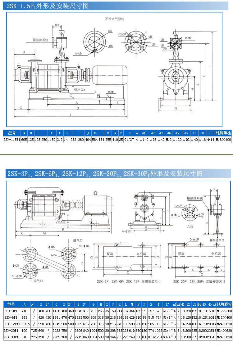 2SK系列适用于吸入压力低于-0.08MPa的工况条件。2SK-P1系列适用于吸入压力低于-0.096MPa的工况条件,在配用大气泵时,极限真空度可达-750mmHg。