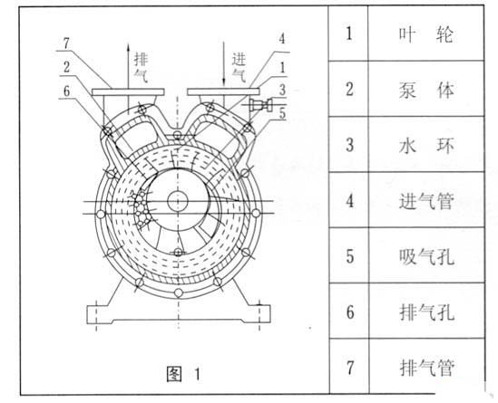 如图1所示,叶轮(1)偏心地装在泵体(2)内,起动时向泵内注入一定高度的水,因此当叶片轮旋转时,水受离心力的作用而在泵体壁上形成-旋转水环(3),水环上部内表面与轮毂相切,沿箭头方向旋转,在前半转的过程中.水环内表面逐渐与轮毂脱离,因此在叶轮叶片间形成空间并逐渐扩大,这样就在吸气口吸入空气;在后半转的过程中,水环的内表面渐渐与轮毂靠近,叶片间的空间容积随着缩小,叶片间的空气因此被压缩而样出。