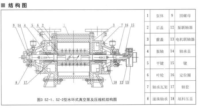 SZ-1及SZ-2的结构如(图3)所示,其与SZ-3及SZ-4结构(图4)不同之处是:进、排气管分别在两个侧盖上,一根管与进气口相通,一根管与排气口相通,泵内无橡皮阀。
