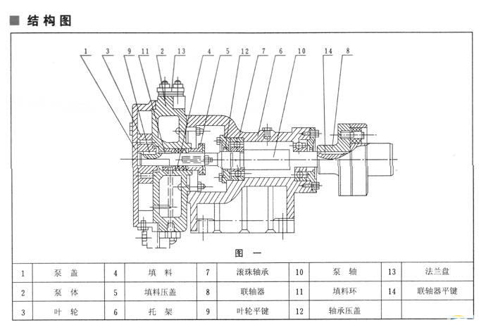 SZB型泵结构如图一所示、工作室由泵体(2)、泵盖(1)构成,上有进排气口 (详见安装图).下有放水累塞(15)(见安装图),泵盖上有指示旋转方向的箭头,泵体有填料函和填料压盖(5),内装填料(4)密封,泵体侧面的螺丝孔(16)(见安装图)为补充水环消耗用水。